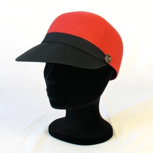 Casquette bicolore en paille Casquette noire et rouge.Ruban noir sur l'avant au dessus de la visière agrémenté d'un bouton décoratif de chaque côté.